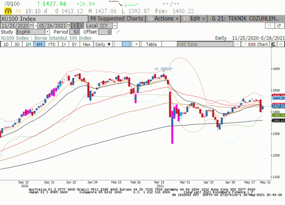 BIST100 endeksinde günün düşük seviyesi 1393 iken kapanışın 1425 üzerinde gerçekleşmesi pozitifti. Bir gün önceki seansta gelen sürpriz satışlar ardından bugün piyasanın bankacılık sektörü önderliğinde yukarı yönlü tepki verdiğini görüyoruz. Güne başlarken Garanti BBVA’ın 367 günlük 294 milyon Euro maliyeti Libor+2.5% olan sendikasyon kredisi sağladığı haberi sektör geneline olumlu yansıdı. Öte yanda bankacılık sektörü nünde içinde olduğu büyük piyasa değerli şirketlerin uluslararası borçlanma piyasası kriterlerine uyum sağlamakta zorlamadığını sürdürülebilirlik ve yeşil tahviller ile göz doldurduğunu söyleyebiliriz. Kapanışta Garanti bank %4.3 Akbank %2.6 Is bank %2.8 değer kazanarak piyasadaki toparlanmaya destek verdi. Ayrıca demir çelik sektörü gayrimenkul ve enerji firmaları da yükselişe öncülük edenler arasındaydı. Bugün 1430 endeks seviyesi üzerinde kalınması durumunda 1445 ara direnç olmak üzere 1465 seviyesi tekrar denenebilir. Ancak bankacılık sektörünün başladığı yükseliş hareketini sürdürmekte başarılı olması şartı aranıyor.