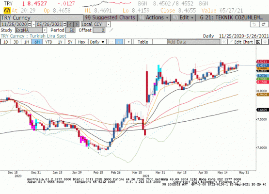 Döviz piyasasında FED üyelerinin açıklamaları ile algının çok sık değiştiği günlerden geçiyoruz. Bir kesim enflasyon geçici derken bir kesim bankanın yüksek enflasyona müdahalesinin gerekeceği ortama hazırlamaya çalışıyor. Bu durumda dünkü seansta Dolar Endeksi’nin (DXY) 89.50 seviyesini test edemeden gün içinde yaşanan kısa pozisyon kapama faaliyeti ile yönünü yukarı çevirdiğini gördük. Son beş işlem gününde gelişen ülke para birimlerinin ABD Doları karşısındaki performansına gelince değer kazanımının ivme kaybettiği söylenebilir. Son beş işlem gününde Türk Lirası ABD Doları karşısında %0.46 değer kaybederken 5 yıllık CDS risk primi 403 seviyesinde aşırı bir değişim olmadığını gösteriyor. Mayıs ortasından bu yana 8.3000 altında fiyatlamaya geçmekte zorlanan Dolar/TL paritesi için kısa vadede 8.4000 altında kapanışlar moral verebilir. Buna rağmen son iki günde yaşanan hareket ile TL’nin haber akışına hassasiyetinin arttığını ve 13 Mayıs yüksek seviyesi 8.5127 üzerinde 8.6800 seviyesine doğru yükseliş potansiyeli olduğunu düşünüyoruz.