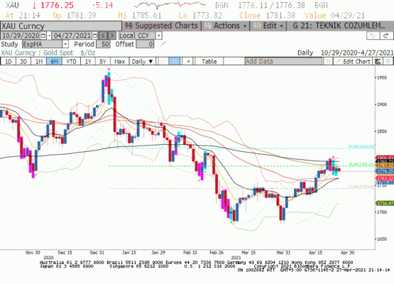 Ons altın fiyatları 27 Nisan seansında dar bir bant içinde hareket ardından 9 günlük üssel hareketli ortalama 1774 üzerinde kapanış yaptı. Bugün yapılacak FED toplantısı sonrasında Dolar ve cinsi varlıkların hareketini beklerken altın destek seviyeleri üzerinde kalmaya çalışıyor. Bugün 1770-1785 Aralığının kırılma yönünü önemsiyoruz. FED ve Powell konuşması sonrası artması muhtemel volatilite ons altın fiyatlarının 1785 üzerine taşır ve bu seviye üzerinde kapanış gerçekleşir ise geçtiğimiz hafta yüksek seviyesi 1798 kabaca 1800 denemesi gelebilir. Son haftalarda fon alımlarına rağmen borsa yatırım fonları aracılığı ile yatırımcı talebinin eksik olduğundan bahsediyoruz. Bu durum henüz değişmedi dün limitli bir giriş olmakla beraber altın fonlarına ilgi zayıf ve toplam altın fon büyüklüğü Mayıs 2020 seviyesine gerilemiş durumda. Kısaca 1800 üzeri kalıcı bir yükseliş hareketi için Altın EFT’lerini takip etmeyi sürdürüyoruz.
