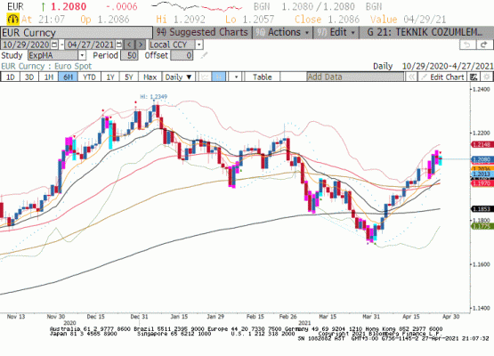 26 Nisan yüksek seviyesi 1.2116 üzerinde harekette zorlanan Euro/dolar paritesinin FED toplantısı ve sonrasında Dolar ve cinsi varlıkların fiyatlamasını beklerken yükseliş denemeleri limitli kalıyor. Öte yanda bu hafta açıklanacak ekonomik verilerde ABD ekonomisinin %6.5 büyümesi beklenirken Avrupa Bölgesi yılın ilk çeyreğinde korona etkisi ile daralabilir. Avrupa genelinde aşılamanın hızlandığını ve Almanya’nın Haziran ayı sonuna kadar yetişkinlerin tamamını aşılamayı hedeflediğini biliyoruz. Ancak aşılama ardından normalleşen ekonomik aktivite ve bunun verilere yansıması zaman alacak. Bu durumda Euro/dolar paritesinin kritik seviye olarak gördüğümüz 1.2050 üzerine yerleşmesi Dolar Endeksi’nde düşüş eğiliminin sürüp sürmeyeceğine bağlı diyebiliriz.