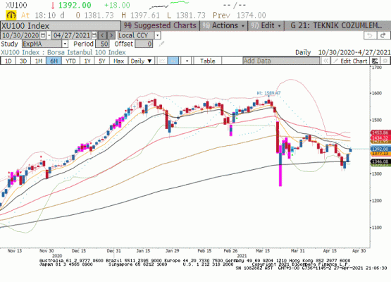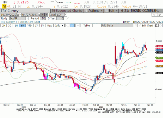 Son beş işlem gününde ABD Doları karşısında gelişen ülke para birimlerinin performansına bakıldığında Rus Rublesi ve Brezilya Real’i ilk iki sırayı paylaşıyor. TL’nin ise ABD Doları karşısında son beş işlem gününde %1.28 değer kaybettiği görülüyor. 26 Nisan haftasına başlarken açılışta Asya seansında görülen 8.4851 yüksek seviyesi sonrasında yaşana geri çekilme ve 27 Nisan seansında 8.2000 altına gerileme TL açısından kısa vadede pozitifti. 27 Nisan seansında 4 haftalık üssel hareketli ortalama olan 8.1800’den destek bulan paritede kapanış 8.2000 üzerinde gerçekleşti. Teknik olarak 8.2000 altında kapanışlar ile Dolar/TL ‘sı 8.1500 seviyesi altında geri çekilme eğiliminde olabilir. Bugün yapılacak FED toplantısı ve sonrasındaki fiyatlamalarda Dolar Endeksi ve uzun vadeli tahvil getirilerinin vereceği tepki önemli iken küresel risk alma iştahı ve Euro/dolar paritesinde yükseliş TL’nin değer kazanımını destekleyebilir.