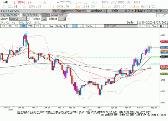 ABD Doları’nın değer kazanımı ve 10 yıllık tahvil faiz oranlarında ılımlı yükseliş ile ons altın fiyatları dünkü seansta tekrar 1900 üzeri fiyatlamaya geçmekte zorlandı. Günün yüksek seviyesi 1903.70 iken kapanış 1900 dolar altında gerçekleşti. Bu nedenle kısa vadede 1890 altında kapanışların zayıflık emaresi olduğu söylenebilir. Biraz daha orta vadeli düşünen yatırımcı için ise 1852 önemli destek olarak görülüyor. Son 8 haftanın 7 sinde yükselen ons altın fiyatlarında 1900 dolar algısı önemliydi. Ancak son 7 haftada yaklaşık 160 dolarlık yükseliş yaşandığına göre bugün yaşanan satışlar normal ve önemli olan haftalık kapanışın nasıl olacağı? 16 Haziran FED toplantısının ve varlık alımları ne zaman konuşulacak beklentisinin fiyatlarda yükselişin önüne geçtiği ortamda altında da dalga boyları artabilir.