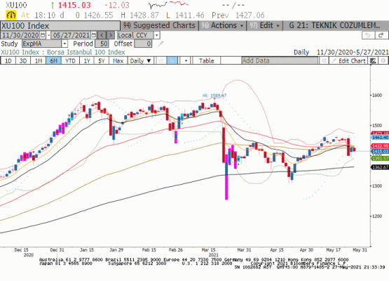 BIST100 endeksinde günün yüksek seviyesi 1428 iken sonrasında yaşanan satışlar ile kapanış 1420 endeks seviyesi altında zayıftı. 26 Mayıs seansında bankacılık sektöründen destek alan BIST100 endeksi 27 Mayıs seansında havayolu taşımacılığı ile destek buldu. Avrupa’da ekonomilerin açılması ve seyahat sezonu ile ulaştırma sektöründe gelen alımların BIST100 endeksi içerisindeki hisse senetlerine de zincir etkisi ile cesaret verdiği söylenebilir. Öte yanda Sağlık Bakanlığı tarafından yapılan bir parti Biontech aşısının geldiği ve Haziran ayında hızlanması beklenen aşılama süreci de ulaştırma sektörü performansına olumlu yansıyor. 21 Mayıs haftasında hisse senedi piyasasına yabancı girişinin 51 milyon dolar olarak gerçekleşmesi ve küresel risk iştahında mevcut iyimserliğin korunması BIST100 endeksi için pozitif olsa da Salı gününden bu yana içerideki haber akışına hassasiyetin arttığını ve kırılganlığın devam ettiğini anlıyoruz. BIST100 1430 endeks seviyesi üzerine yerleşmedikçe genele yayılan bir yükseliş eğilimi güç görülüyor.