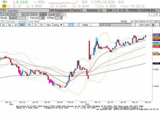 ABD tarafında ekonomik takvimin yoğun olduğu dünkü seansta Dolar Endeksi 90.00 etrafında fiyatlamayı sürdürdü. Gelişen ülke para birimleri fiyatlamasında da sakin bir seyir olduğunu söylenebilir. Son beş işlem gününde ABD Doları karşısında performansı ile ilk sırada yer alan para birimleri Güney Afrika Randı, Güney Kore Won’u ve Çin Yuanı olarak görülüyor. TL fiyatlamaya gelince son beş işlem gününde ABD Doları karşısında %1.56’lık değer kaybını işaret ediyor. TCMB istatistiklerine göre 21 Mayıs haftasında tahvil bono piyasasına 175 milyon dolar hisse senedi piyasasına 51 milyon dolar yabancı giriş olduğu görüldü. 5 yıllık CDS risk primi 400 seviyesine doğru geri çekilirken 10 yıllık tahvil faiz oranı son beş işlem gününde 15 baz puan yükseliş ile %18.36 olarak kapanış yaptı. Kısa vadede önemli gördüğümüz 8.4000 altına geri çekilmekte gönülsüz olan Dolar/TL paritesi bu seviye altına yerleşmedikçe günlük grafikte bollinger üst bant 8.5300 üzerinde artan volatilite ile 8.6800 seviyesine yükseliş potansiyeli taşıyor.