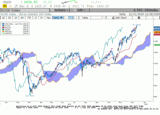 Son zamanlarda enflasyon ile mücadele konusunda atılan adımlar TL varlıklara olan talebi artırırken, yabancı yatırımcının talebinin de hala devam ettiğini görüyoruz. Yıl genelinde özellikle yerli yatırımcı talebi ile rekor seviyeler test eden endeskte önümüzdeki dönemde yabancı yatırımcı talebinin de artarak devam etmesi halinde yeni rekor seviyeleri test edebileceğimizi düşünüyoruz. Haftanın son işlem gününde özellikle yurt dışı piyasaların kapalı olması nedeni ile işlem hacmi düşük seyretmiş olmakla birlikte endekste orta-uzun vade yükseliş trendi beklentimizi koruyoruz.