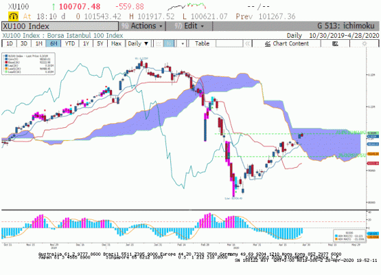 Asya seansına iyi başlayan küresel piyasalar aktif seansta Amerika'da Mayıs ayının ilk haftasında ekonominin açılmayacağı kesinleşince satış eğilimine girdi. Öte yanda havayolu ile ulaşımın da Mayıs ayı sonunda başlayacağı yönünde haberler geliyor. Dışarıda satışlar içeride bankacılık sektörünün dünkü performansı gösteremeyişi ile birleşince BIST100 endeksi 101.917 gördükten sonra geriledi ve kapanış 100.700'de gerçekleşti. Türkiye 5 yıllık CDS primi 594 ile yüksek seviyesini koruyor. Tahvil bono piyasasında 2 yıllık bileşik yüzde 9.02 ve 10 yıllık yüzde 11.71 seviyesinde kapattı. Dışarıda Dolar DXY endeksinde 100 endeks seviyesi altına geriledi. Buna rağmen Dolar/TL paritesi 7.000 TL sınırının hemen altında geri çekilme emaresi göstermiyor. Dışarıda Asya seansında olumlu fiyatlamalar ile bugün içeride hisse senedi piyasaları pozitif açılış yapabilir. Devamı öğleden sonra açıklanacak ABD ilk çeyrek büyüme rakamı ve FED'i beklerken piyasaların tepkisine bağlı görülüyor.