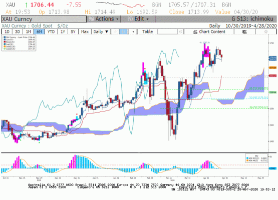 Teknik olarak, ons altın 1.700 üzerinde kalabilirse kısa vadede ilk durak 1.715 dolar olabilir. Teknik görünüm önceki haftaya kıyasla zayıfladı ve geri çekilmenin devamı durumunda 22 Nisan düşüğü 1.680 dolar destek olarak görülüyor.