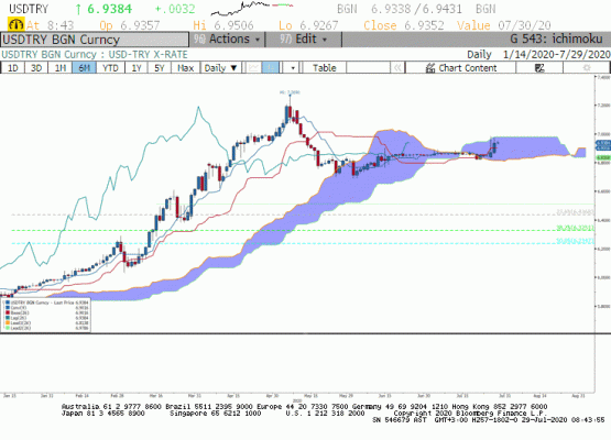 USD/TRY paritesi haftanın ilk işlem gününde 6,8542 ile 6,9745 bandında hareket ederken akşam saatlerinde paritenin 6,8657 seviyesinde dengelendiğini gördük. Geçtiğimiz gün, gün içinde Dolar'ın gelişmekte olan ülke para birimleri karşısında değer kazandığını gördük. Diğer yandan BDDK'nın swap ile ilgili uyguladığı kısıtlamaları kaldırması ve normalleşmeye gitmesi paritede yükselişe sebep oldu. Küresel piyasalarda ise ABD-Çin geriliminin artması piyasalar üzerinde baskı yaratmaya devam ediyor. Diğer yandan bugün TCMB'den enflasyon görünümü açıklanacak. Beklentimiz enflasyon hedeflemesinde revizeye gidileceği yönünde. ABD tarafında ise faiz oranları kararı ve FOMC açıklamaları önemli olacak. FED'in faiz kararında değişikliğe gitmesi beklenmezken, güvercin duruşunu korumasını bekliyoruz.
