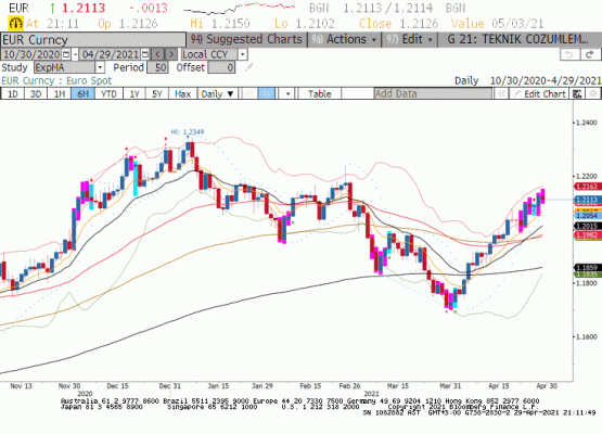 Euro/dolar paritesinin 1.2150 ve üzeri hareket için zorlandığını ve yükselişin devamı için Dolar Endeksinde düşünün devam etmesi gerektiği görüşümüzü koruyoruz. Dün açıklanan ilk çeyrek büyüme rakamında ABD ekonomisi %6.4 büyüme kaydetti. Avrupa ve ABD arasındaki ekonomik veriler karşılaştırıldığında Euro’nun değer kazanımı zorlaşıyor. İlk çeyrek rakamlarında Avrupa’da daralma beklenirken ABD ekonomisi ilk okumada yüzde 6.8 GSYIH artışı gösterdi. Bugüne gelindiğinde Almanya, İtalya, İspanya, Fransa ve Euro Bölgesi ilk çeyrek büyüme rakamlarını öğrenmiş olacağız. Euro Bölgesinin yılın ilk çeyreğinde yüzde 0.8 daralma kaydedeceği tahmin ediliyor. Bu tabloda yılın ikinci yarısındaki ekonomik iyileşmeye rağmen Euro/dolar paritesinin 1.2150 üzerinde kalarak yükselişini sürdürmesi Dolar Endeksine bağlı diyebiliriz.