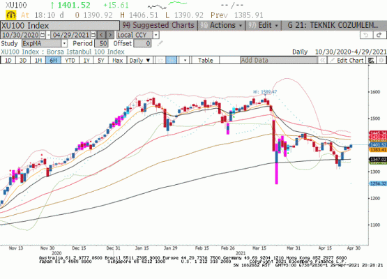 Dışarıda küresel endeksler Çarşamba günü FED toplantısından alınan destek ve pozitif bilançolar ile günün ilk yarısında yükselişteydi. Sonrasında bu yükseliş hareketinin sorgulandığını ve küresel desteklerin gün içi destek seviyelerine doğru geri çekildiğini gördük. BIST100 endeksi de bu hareketlilikten etkilendi ancak genel olarak öncesinde küresel endekslerden ayrışan ve geçtiğimiz haftalarda daha ziyade satıcıların kontrolünde olan BIST100’ün bu dönemde iç dinamikler ile hareket etmesi beklenebilir. Hafta başından bu yana 2020 senesinin lokomotif sektör ve hisse senetlerinin bilançolarını alıyoruz. Seans kapanışından sonra gelenlerde dahil olmak üzere ilk çeyrek bilançolarının şimdilik piyasa beklentisini karşıladığını ve pozitif olduğunu görüyoruz. 29 Nisan tarihinde başlayacak ve 17 Mayıs tarihine kadar sürecek tam kapanmanın sanayi sektörü üzerindeki etkisi limitli olacak. Ancak başta servis sektörü olmak üzere ekonomik aktivitede yavaşlama kuşkusuz hissedeceğiz. Geçtiğimiz aylarda endeksin yükseldiği dönemlere kıyasla düşük diyebileceğimiz işlem hacmine rağmen BIST100 endeksi bugün de 1400 üzerinde kalabilir ise kademeli olarak 1445 seviyesine doğru yükselişini sürdürebilir.
