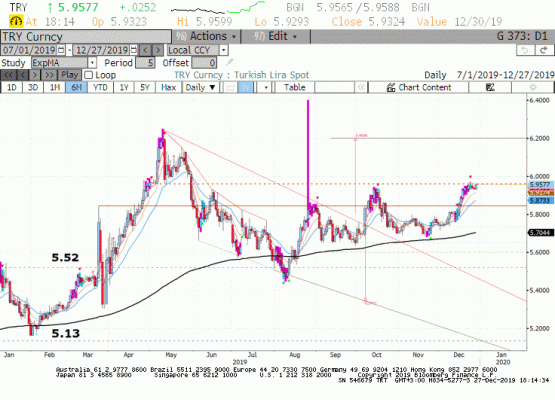 Teknik açıdan Barış pınarı harekatında test edilen zirve 5.9380 ve 2018 ağustos kur şokundan sonra 5.45 hareketinin başladığı seviye olan 5.96 dirençleri önemini korumaktadır. 5.9380-5.96 direnç bölgesi kırılmadığı sürece aşağı yönde hareket olasılığının DXY ve CDS hareketinden dolayı bir adım önde olduğunu düşünüyoruz ancak eğer 5.9380-5.96 direnç bölgesi kırılırsa kurda 6.00 lira üzerine doğru hareket bekleriz.
