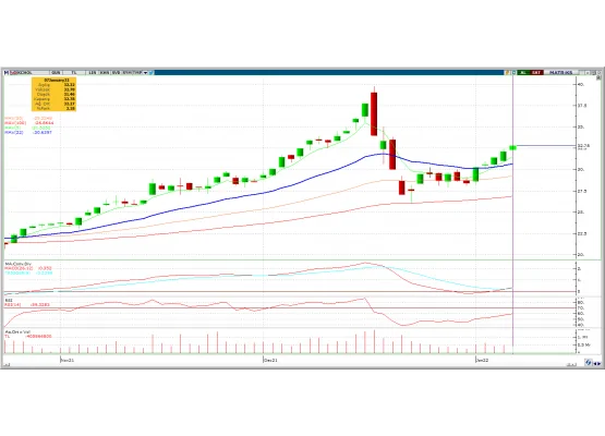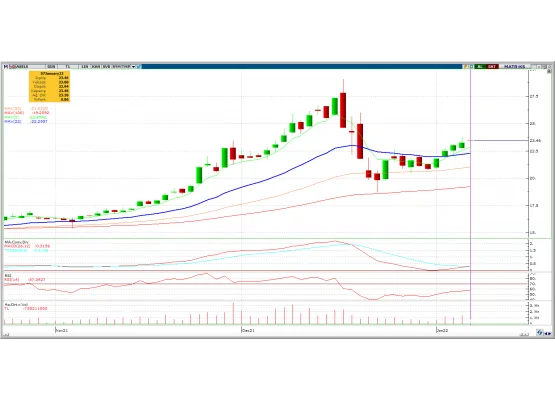 Endeksteki pozitif görünümle beraber önemli bir bölgeden güçlü haftalık mum gelmesi ile kritik bir direnç olan 22.80 seviyesinin geçilmesiyle beraber yükseliş hareketi başlamış olabilir. Görünümün hedefi 26.60 seviyelerini test edebilir . Stop seviyesinin yakın ve riskin düşük olması ile hareketin devamı beklenebilir. Hacimdeki yükselişle hareket güçlenebilir. MACD ve RSI göstergeleri pozitife döndü ve hareketi destekler nitelikte.