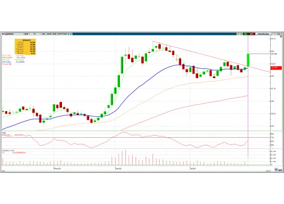 Geçtiğimiz hafta hem düşen trendini hem de yatay konsolidasyon bölgesini yukarı doğru kırmayı başaran Gübre Fabrikaları güçlü bir yükseliş hareketi içerisinde olabilir. Son günkü büyük gövdeli mumun ve son dönemlerin en büyük hacminin yaşanması da potansiyelin sinyalleri niteliğinde. Eğer formasyon devam ederse hareketin yukarı yönlü devam etmesi beklenebilir . Stop bölgesinin yakın olması ve yukarıdaki potansiyelin hala bulunması nedeniyle kısa vadeli trade fırsatı olarak değerlendirilebilir.