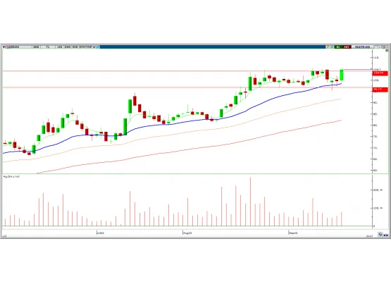 Geçtiğimiz haftayı 2,05% oranında yükseliş ile tamamlayan hisse, son bir aylık işlemlerde tepede oluşan yatay bant üzerinde en yüksek kapanışı gerçekleştirerek yeniden ivme kazandı. Hafta biterken Cuma günü gelen kuvvetli alımların etkisi ile haftayı en yüksek seviyesinden kapatması yükselişin devamı adına sinyal olabilir. 100,00 TL güçlü seyrini korumasını beklediğimiz hissede 112,40 direncine doğru yükselişin devam etmesi beklenebilir.