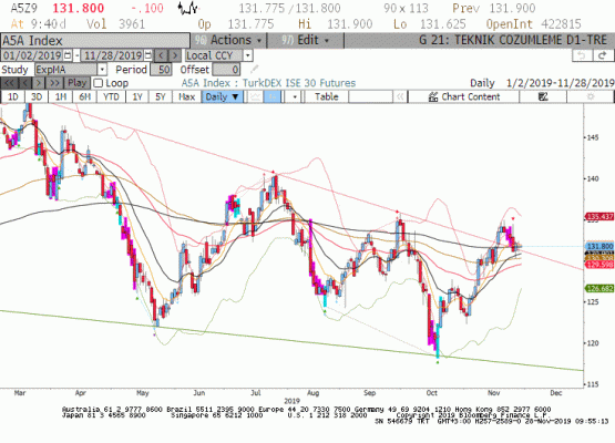 Endeks son üç işlem gününde 133.700 seviyesinde üçlü tepe oluşumu gösterirken aynı zamanda kuvvetli yükseliş trendinde en son test ettiği tepe olan 134.950 seviyesinden sonra da konsolidasyonla birlikte momentum kaybetmeye devam ediyor. Aşağı yönlü hareketlerin dün de belirttiğimiz gibi 200 günlük ortalamanın geçtiği 131.725 seviyesi ve hemen altında 26 kasım tarihinde pull-back support olarak çalışmış ve trende katılım fırsatı sağlamış olan 18 günlük üssel ortalamanın geçtiği 131.400 seviyeleri ile sınırlı kalmasını bekleriz. Gün içi yükselişlerde ise 133.700 seviyesi hareketin devamı açısından kritik bir direnç olarak izlenmelidir.