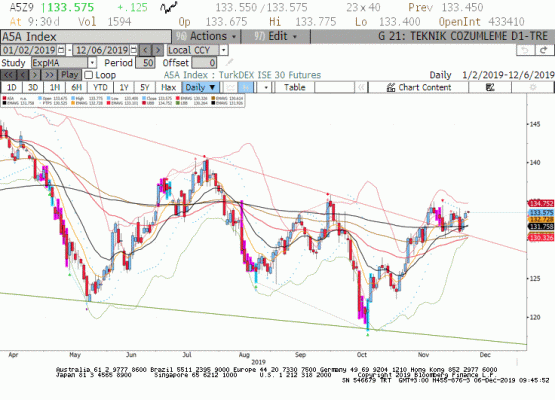 Orta vadede trend yuakrı yönlü gelişmeye devam ediyor ve endeks kritik hareketli ortalamaları üzerinde bulunmaya devam ediyor. Ancak Stochastic ve RSI momentum eğrilerinin günlük grafiklerde gerilemeye devam etmesini gösterdiği üzere momentum azaldı ve yorulma işaretleri var. Bu nedenle yatay fiyat hareketinin devam edeceğini düşünüyoruz. Geri çekilmelerde günlük grafikte trend desteği görevi gören 9-18-200-100 günlük üssel ortalamalarda pull back support olarak long pozisyon alınabilir. 9-18-200-100 günlük üssel ortalamalar sırasıyla 132.700-131.900-131.750-130.600 seviyelerinden geçiyor. Özellikle 26 kasım tarihinde pull back support olarak çalışan 18 ve 100 günlük üssel ortalamalar long pozisyon almak için uygun desteklerdir. Yükselişlerde ise geçen hafta endeksi tutan 134.125 ve daha yukarıda 135.000 seviyeleri önemli ara dirençlerdir.