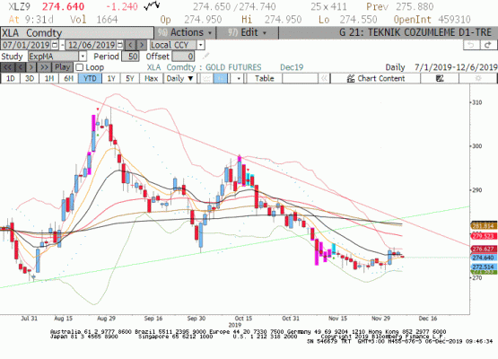 Altın ons ve Dolar kurundaki seyrine bağlı olarak 271.700 seviyesine kadar gerileme devam edebilir. 271.700-270.000 lira seviyelerinin uygun stop loss marjları ile long pozisyon alınabilecek seviyeler olarak görünmektedir. Haftanın ilk işlem gününde yükselişlerin 276.600 ile sınırlı kalmasını bekleriz.