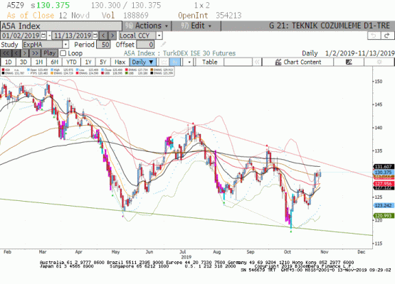 Geçen hafta cuma gününden beri endeksi yukarı yönlü tutan 131.000 direnci üzerinde yapılan kapanışla mart ayından gelen alçalan trendin geçtiği 132.350 seviyesine hareket potansiyeli belirginleşti. Dün gerçekleşen Trump-Erdoğan görüşmesinden sonra Döviz fiyatlarındaki sakin seyir ve CDS'in dün de gerilemesi yukarı yönlü trendin devamını sağlayabilir. Ancak piyasa gün içi zaman aralıklarında aşırı alım bölgesinde olması yanı sıra günlük zaman aralığında da 9 periyotluk RSI göstergesi 70 sınırına ulaştı. Bu nedenle devam edebilecek yukarı yönlü harekette 132.350 seviyesinin önemli direnç olabileceğine dikkat edilmelidir. Geri çekilme ile tekrar 131.000 seviyesi kırılırsa dünün en düşük seviyesi 100 günlük fiyat ortalaması 129.800'e kadar tepki satışları gelebilir.