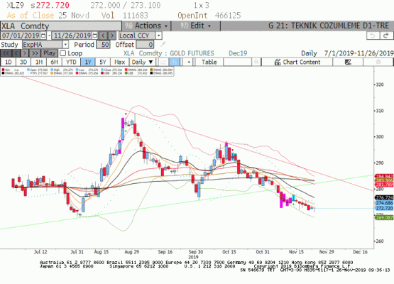 Bugün eğer Dolar TL'de önemli bir hareketlenme olmazsa Gram Altın fiyatında düşüş bekliyoruz. 271-270 lira seviyelerine gerileme görülebilir. Trend takibi yapanlar için 9 periyotluk üssel ortalama ve parabolic stop noktası kesişimi 274.60 lira seviyesi short pozisyonlar için iz süren stop olarak değerlendirilebilir. 274.60 lira seviyesi altında trend kuvvetli biçimde aşağı yönlü gelişmektedir.