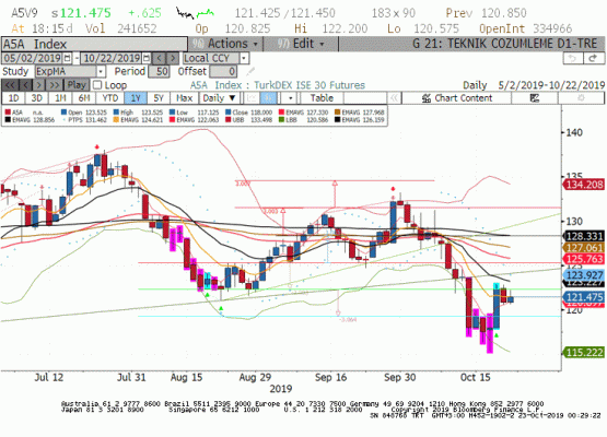 Teknik olarak 122.325 ile 119.275 aralığındaki fiyatlama bölgesi korunuyor ancak 122.325 seviyesinin kırılma olasılığı bulunmaktadır. Özellikle kısa dönem momentum göstergelerinin de pozitif seyri haber akışı ille desteklenirse gün içinde 124.150 direncine kadar yükseliş görülebilir. Beklentimiz aksine 122.325 seviyesinin güncelliğini koruması durumunda 119.275-122.325 aralığında yatay hareket devam edecektir.