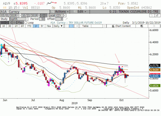 Dün bültende önemli direnç olduğunu belirttiğimiz 50 günlük ortalama 5.8638 seviyesinden geçiyor ve dün ekim vade kur bu seviye yakınlarında satışlarla karşılaştı. 5.80 seviyesine doğru gerileme devam edebilir. 5.80 kritik bir destek olarak izlenmelidir.