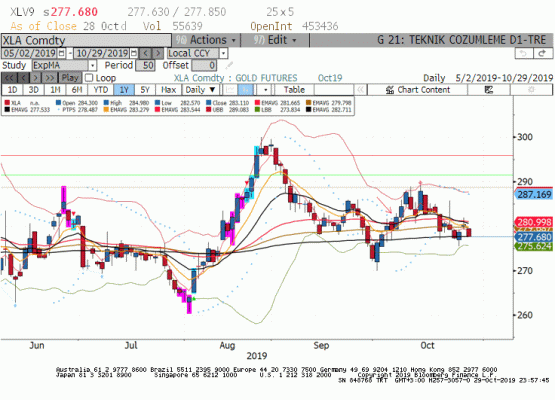 Ekim vade gram altın pazartesi günü satıcılı eğilim beklentimize uygun düşüş kaydetti ve tahmin ettiğimiz 277.60 seviyesine gerileyerek seansı tamamladı.