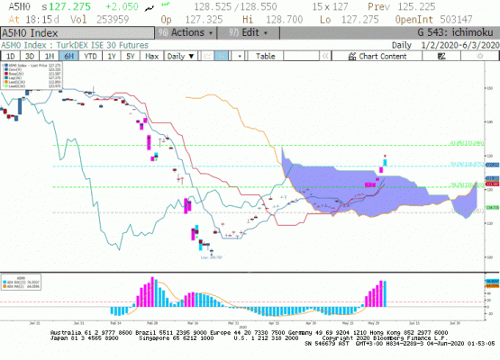 Teknik açıdan kontratta yükseliş trendi devam ederken ilk önümüze çıkan direnç seviyesi 128.500 olarak ön plana çıkmakta. Bugün küresel piyasalardaki pozitif kapanışa paralel yurt içi piyasaların da pozitif açılış yapmasını bekliyoruz.
