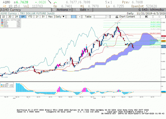 Teknik olarak, Haziran vadeli Dolar/TL paritesinde 6.7515 desteği altında 6.7480'a doğru geri çekime görebiliriz. Yukarıda 6.7685 ve 6.7740 direnç olarak görülüyor.