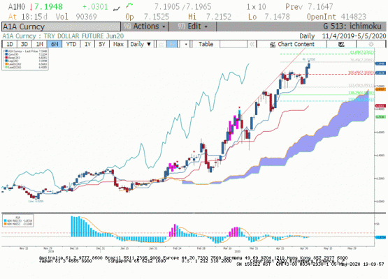 05 Mayıs seansında 7.1000 seviyesi üzerinde kalınması ile 7.2100 direnci test edildi. Dışarıda Almanya Anayasa Mahkemesi'nin ECB'nin tahvil alım proğramına temkinli yaklaşımı ve proğramın Avrupa Birliği anlaşması ile desteklenmediğini açıklaması Euro'nun değer kaybetmesini sağladı. Bu şartlarda dışarıda Dolar Endeksi'nin tekrar 100 endeks seviyesine yaklaştığını ve diğer gelişen ve gelişmiş ülke para birimlerinis ise tekrar baskılandığını gördük. Türkiye 5 yıllık CDS primi haftaya başlarken 625 seviyesinde iken dün daha pozitif fiytalama ile 602 seviyesine geriledi. İçeriden döviz piyasası dışarıdan küresel merkez bankaları ile swap anlaşması beklerken içeride TCMB bankaların swap piyasasında yabancı para cinsinden borçlanma limitini yüzde 30'dan yüzde 40'a yükseltti. Açıklanan resmi verilerde Ocak ayında 86.4 mia dolar olan brüt döviz rezerlerinin 24 Nisan tarihi itibari ile 20 milyar dolara gerilemiş olması TL negatif fiyatlanıyor.
