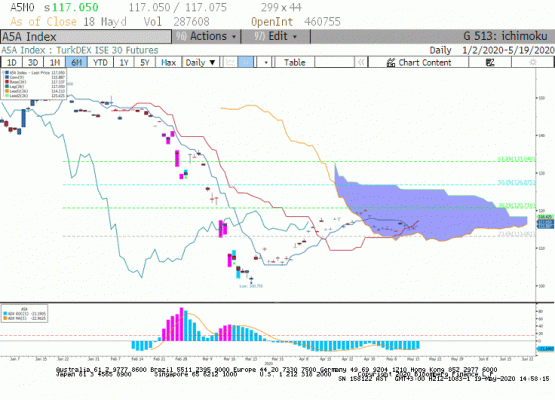 Haziran vadeli BIST30 endeksi 18 Mayıs seansını 117.050 seviyesinde yükseliş ile kapadı. Dışarıda küresel hisse senedi piyasalarında yükselişin devam etmesi ve TL'in değer kazanımı yanında bankacılık sektörü hisse senetlerinde göreceli toparlanma vadeli endeks için pozitifti. 19 Mayıs tatili nedeni ile kapalı olan piyasalar yeni güne başlarken biraz daha moralli olabilir. Nedeni dün FED Başkanı Powell ve Steven Munichen'in kongre sunumu ardından yeni teşvik paketi beklentisi ve virüs aşısına ilişikin olumlu gelişmeler diyebiliriz. Bunun yanında gün içinde TCMB'in Japonya ve İngiltere ile swap anlaşması yapacağı haberleri yetkililer tarafından yeni yapılmış bir swap anlaşması yok görüşmeler devam ediyor şeklinde düzeltilse de bu taraftaki beklenti TL'in değer kazanımı sağladı. Bu durum bankacılık sektörünün de katılımı ile vadeli BIST30 endeksini 120.710 direncine taşıyabilir.