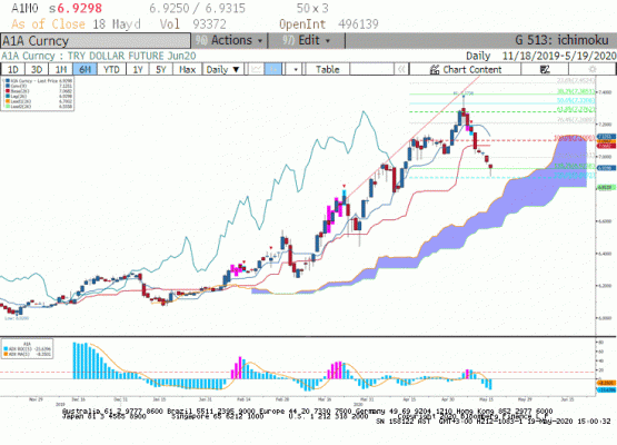 Haziran vadeli Dolar/TL paritesi 18 Mayıs seansında en düşük 6.8765'i gördükten sonra günü 6.9298 seviyesinde kapadı. 18 Mayıs günü Türkiye 5 yıllık CDS primi 615 seviyesinde iken piyasaların kapalı olduğu 19 Mayıs tarihinde 5 yıllık CDS primi 580 seviyesine geriledi. Küresel piyasaların risk alma eğilimi devam ederken Dolar Endeksi (DXY) 99.500 altına geriledi. 19 Mayıs tarihinde Japon Yeni dışında tüm gelişmiş ülke para birimleri Amerikan Doları karşısında dengeli bir şekilde değer kazandı. Döviz piyasasında uzun zamandır göremediğimiz bu hareket gelişen ülke para birimlerine de olumlu yansıdı. Son 5 günde TL'in 24 gelişen ülke para birimi arasında Amerikan Doları karşısında yüzde 3.10 değer kazanımı ile 3. sırada yer aldığını görüyoruz. Dün Habertürk'ün TCMB'in Japonya ve İngiltere ile swap anlaşmasının zaman meselesi olduğu haberi yetkilier tarafındam henüz sonuca ulaşılmış yeni bir swap anlaşması yok şeklinde düzeltilse de bu beklenti TL'in değer kazanımı destekliyor. Güne başlarken dünkü TL kazanımı yönünde eğilimin sürmesi ile Haziran vadeli Dolar/TL paritesi düşük açılış ile 6.8150 desteğine doğru geri çekilebilir.