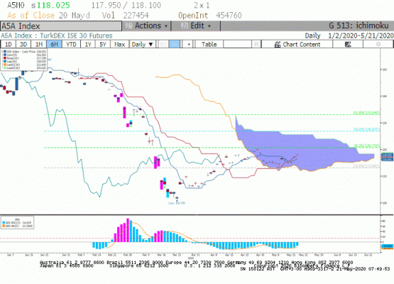 Küresel hisse senedi ve emtia piyasasında alımlar sürüyor. 20 Mayıs seansında Dolar Endeksi (DXY) 99.00 seviyesine doğru geri çekildi. S&P500 volatilitesini gösteren VIX endeksi 28.00 seviyesine geri çekildi. Kısaca küresel piyasaların risk alma iştahı devam ederken içeride vadeli BIST30 endeksinin de gün içinde pozitif performans gösterdiği görüldü. Vadeli BIST30 endeksinde 118.275 günün yüksek seviyesi iken kapanış 975 puan artış ile 118.025 seviyesinde gerçekleşti.