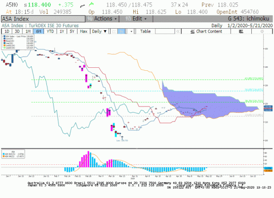 Küresel hisse senedi piyasalarında yükselişin ivme kaybettiği söylenebilir. VIX endeski dünkü seviyelerine benzer 28 civarında işlem gördü. Haziran vadeli BIST30 endeksine gelince günü 118.400 seviyesinde kapadı. Spot endeks içinde sektörel performansa bakıldığında birkaç haftadır gözlenen hareketten farklı bir tablo olmadığını görüyoruz. Bankacılık sektörü hisse senetleri zayıf seyrini korurken hizmetler endeksi 1.200 puan artıda sinayi sektöründe ise yükselişin momentum kaybına uğradığı anlaşılıyor. Türkiye 5 yıllık CDS priminde geri çekilme devam ediyor. Haftalar sonra ilk kez 5 yıllık CDS primi 550 seviyesi altına geriledi.