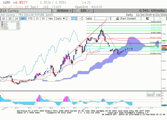Teknik olarak, Haziran vadeli Dolar/TL kontratında geri çekilmelerde 6.8445 desteği altında 6.8350 seviyesi ön plana çıkarken yükselişlerde 6.8650 ve 6.8725 direnç olarak görülüyor.