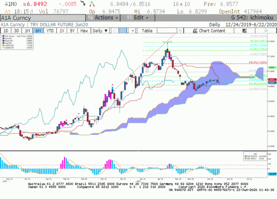 Teknik olarak, Haziran vadeli Dolar/TL kontratında geri çekilmelerde 6.8445 desteği altında 6.8350 seviyesi ön plana çıkarken yükselişlerde 6.8650 ve 6.8725 direnç olarak görülüyor.