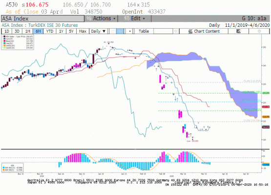 Nisan vadeli BIST30 endeksi yeni haftaya 106.675 puan seviyesinde başlıyor. Haftanın son işlem gününde bankacılık sektöründeki zayıflığa rağmen Tupraş başta olmak üzere enerji sektörü hisselerinin performansı BIST30 vadeliye pozitif yansıdı. Haftanın ilk işlem gününde yapılması planlanan OPEC toplantısı 08 Nisan tarihin ertelendi. 03 Nisan seansında %25 yükselen petrol fiyatlarının enerji sektörü hisse senetleri üzerindeki etkisini düşününce OPEC toplantısı kısa vadede hisse senedi piyasaları üzerinde daha fazla etkili olacak. Öte yanda bu hafta ve önümüzdeki hafta yine virüs salgınına ilişkin seyri takibe devam edeceğiz. Buna rağmen Küresel Merkez Bankalarının önlemlerinin önümüzdeki iki haftada hisse senedi piyasalarını sakinleştirme ihtimalini yüksek görüyoruz. Ancak gelişen ülke piyasalarında alış yönlü tepkiler limitli kalabilir. Çünkü bu salgının ekonomik etkilerini gelişen ülke ekonomileri daha zor atlatacak gibi görünüyor.