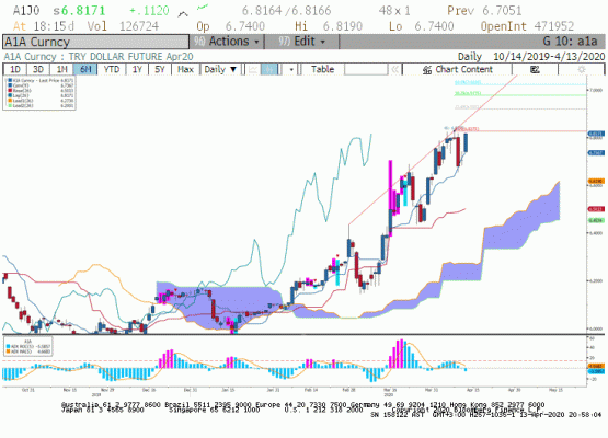 Geçtiğimiz hafta. 08 Nisan tarihinde görülen 6.8275 ardından IMF swap beklentisi ile 09 Nisan tarihinde 6.6525 görüldü. 13 Nisan tarihine gelindiğinde açılış 6.7400 iken kapanış 6.8171'de gerçekleşti. Geçtiğimiz hafta vadeli BIST30 endeksinde olumlu fiyatlamaya rağmen TL'in değer kazanımı sınırlıydı. Bugünkü fiyatlamada BDDK'ın swap hamlesi ardından TL'in değer kaybı IMF ile swap alternatifinin rafa kalktığı çıkarımı olduğu söylenebilir.
