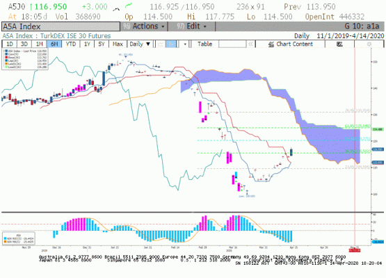 Küresel hisse senedi piyasalarında Asya'da olumlu açılış günün geri kalanında da endekslerin ılımlı yükseliş trendini koruması ile sona erdi. Nisan vadeli BIST30 endeksi küresel hisse senedi piyasalarından aldığı olmlu etkileşim ile 14 Nisan seansında da yükselişini sürdürdü. Endeks seansı 2.975 artış ile kapadı. Avrupa'nın açılması ile Türkiye 5 yıllık CDS primi 10 nisan fiyatlamasına kıyasla yükselerek 560.00 etrafında işlem gördü. Buna rağmen BIST30 hisse senetlerinin içinde hizmet sektöründeki fiyat yükselişine bankacılık sektörünün katkısı eklenince Nisan vadeli BIST30 115.500 üzerinde gün içinde 177.700 direncini test etti. Bugün yine yurtdışı hisse senedi piyasalarından alınacak destek önemli görülüyor. Öte yanda TL'in değer kaybının BIST30 üzerindeki negatif etkisinin sınırlı olmasını yerli yatırımcının portföyünün bir kısmını hisse senedinde taşıma isteğine bağlıyoruz.