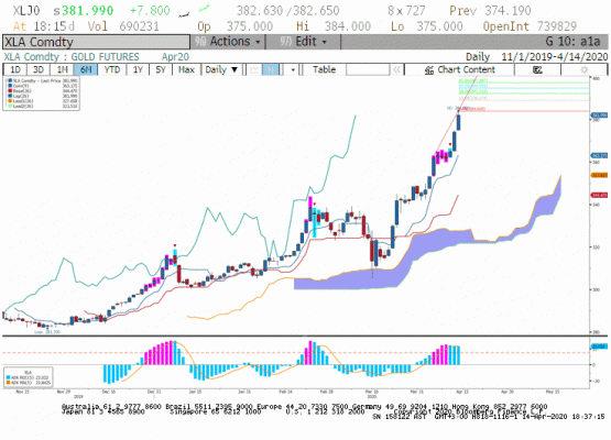 Nisan vade gram altın 14 Nisan seansında iki değikenden de destek alırken 7.800 puan yükseliş ile günün kapanışı 381.990 seviyesinde gerçekleşti. Güçlü yükseliş trendi sürüyor. Gün içinde ons altında 1.750 hedefine ulaşıldı. Bu seviyeden gelen satışlar hızlı yükselişin ardından yorgunluk emaresi olarak değerlendirilebilir. Örta vadeli yatırımcı olan ETF fon yatırımcısı piyasadan çıkmak istemediği sürece ons'ta düşüşler kısa soluklu olarak kalabilir. Dolar/TL paritesinde ise yükseliş eğilimi sürüyor. Bu iki değişkenin bir araya gelmesi ile gram altında düşüşler alım fırsatı olarak görülebilir.