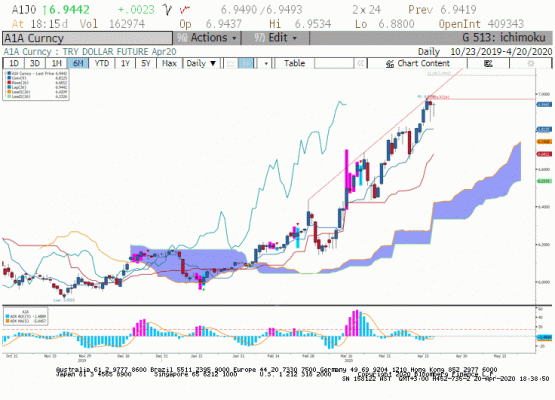 Dışarıda Dolar (DXY) endeksi 100 etrafında yatay hareketini sürdürüyor. İöeride Nisan vadeli Dolar/TL paritesinde günün düşük seviyesi 6.8800 iken kapanış bir önceki günkü seviyeye yakın gerçekleşti. Türkiye 5 yıllık CDS primi 620 altına geriledi. Dışarıda gelişen ülke para birimleri Amerikan Doları karşısında zayıf seyrini sürdürüyor. Gelişen ülke ETF'lerinden sene başından bu yana 10.3 milyar dolar çıkış gerçekleşmiş. Virüs salgının borçluluğu yüksek gelişen ülkeleri olumsuz etkileyeceği beklentisi avardı. Bu nedenle tünelin ucunda bir ışık var ama tam emin olmadan gelişen ülke riski almayalım diyen yatırımcı çoğunluğu oluşturuyor. Hafta içinde TCMB'in dışarıdan gelişmiş ülke Merkez Bankaları ile swap yapma alternatifi gerçeğe dönüşürse vadelİ Dolar/TL paritesi 6.8100 ardından 6.7400'e doğru gerileyebilir. Yukarıda 16 Nisan yükseği 6.9724 üzerinde 7.1000 hareketi mümkün görülüyor.