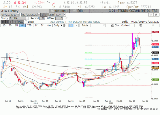 Nisan vade Dolar/TL günü 6.5134 seviyesinde -.0244 düşüş ile tamamladı. Dışarıda Dolar (DXY) endeksinde 101.500-102.000 arasında kararsız bir seyir var. DXY'da 24 Mart seansında yaşanan satış baskısının devam etmeyişi ile gelişen ülke para birimlerinde yükseliş hız kesti. Opsiyon piyasasında 3 aylık zımni volatilite 17.64 (önceki 18.54) iken 25 Delta Risk Reversal 7.03 (önceki 6.88) ile volatilitede düşüşe rağmen dolar alım opsiyon talebinin 24 Mart'a kıyasla artmış olduğunu gösteriyor. Anlaşılan opsiyon piyasasında yatırımcı düşen fiyatları alım yönlü fırsat olarak değerlendirdi. Kısa vadeli göstergelerde biriken 'satış sinyalleri' Türk Lirası pozitif ancak dışarıda döviz piyasasındaki hareketin bu durumu desteklemesi gerekiyor. Türk Lirasında iyimserlik sınırlı kalabilir.