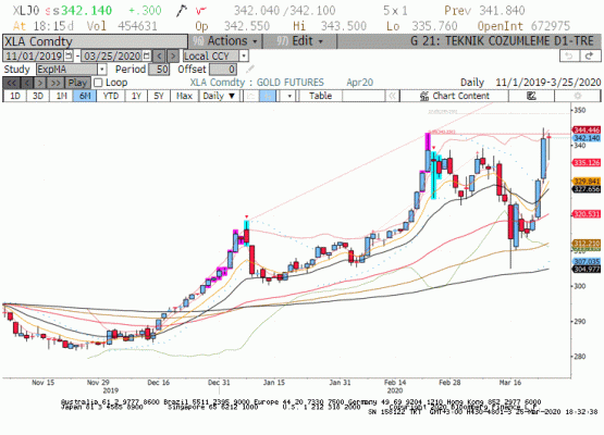 Nisan vade gram altın dün günü 342..140 lira seviyesinde kapadı. 24 Mart seansında yaşanan hızlı yükselişin ardından bugün vadeli gram altın dengelenme sürecinde idi. Amerikan 10 yıllık tahvil faiz oranlarında düşüşün devam etmesi de alıcıları cesaretlendirdi ve dolar/ons cinsi fiyatlamada altın 1600 dolar üzerine yerleşti. Perşembe günü opsiyon piyasasında Nisan vadeli altın kontratlarının son işlem günü ve tahvil bono piyasasında oranlarda sert bir düşüş olmadıkça içeride değerlenen TL'ye rağmen yukarı yönlü trendin korunacağını düşünüyoruz.