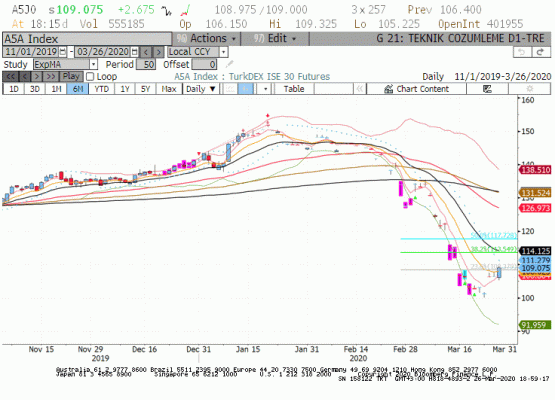26 Mart seansında Nisan vadeli BIST30 endeksi 109.075 seviyesinde 2675 puan yükseliş ile kapanış yaptı. Amerika'da 2 trilyon dolarlık teşvik paketi senatoda onaylandı. Öte yanda haftalık işsizlik maaşı başvurularında artışın 3.3 milyon olarak 1.7 mio olan beklentinin çok üzerinde gerçekleştiğini gördük. Kötü ekonomik veriye rağmen Amerikan endekslerindeki toparlanmanın devam ediyor olması pozitif diyebilririz. Küresel hisse senedi piyasaları bugünlerde kötü gelen ekonomik veriler yerine ileriye dönük toparlanma ihtimalini fiyatlama eğiliminde görünüyor. Bu durum Nisan vadeli BIST30 endeksindeki fiyatlamanın da poiztife dönmesini sağladı. Güne başlarken S&P Haziran vadeli endeks dünkü kapanışa göre %2.0 düşüş ile 2550 seviyesinde işlem görüyor. Amerika'da ve Avrupa'da virüs vaka sayısında artış yükselişin önünü kesti. İçeride Nisav vadeli BIST30 endeksi benzer bir hareket ile güne geri çekilme ile başlayabilir.