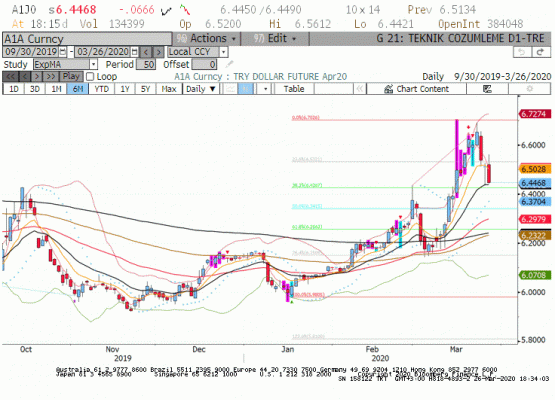 Teknik olarak, Nisan vadeli Dolar/TL paritesinde 6.4250 desteğinin aşağı yönde kırılması ile 17 Ocak-16 Mart yükselişinin yüzde 50 fibo desteği olan 6.3400 seviyesine doğru düşüş sürebilir. Yukarıda 6.5300 üzerinde 6.6400 ve 6.7000 direnç olarak görülüyor.