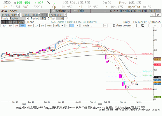 31 Mart seansında Nisan vadeli BIST30 endeksi 105.450 önceki kapanışına yakın bir seviyede kapadı. S&P500 endeksinin başı çektiği küresel hisse senedi piyasalarının zayıf açılış ardından kayıplarını telafi edip pozitife dönmesi ile içeride de benzer bir hareket yaşandı.