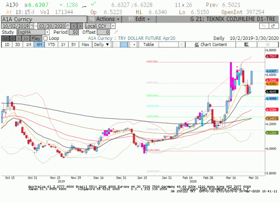 Nisan vade Dolar/TL günü 6.6307 seviyesinde +.1286 yükseliş ile tamamladı. Dışarıda Dolar Endeksinde 98.200 seviyesine doğru geri çekilmenin ardından yön tekrar yukarı dönmüş görünüyor. Bu şartlarda döviz piyasası güvenli para birimi olarak gördüğü Amerikan Dolar'ına dönüş yapmakta tereddüt etmedi. Kalıcı olmayabilir ve tekrar DXY (Dolar Endeksi) gerileyebilir. Ancak bunun için Avrupa ve Asya başta olmak üzere ekonomşk veri setinin bu tarz bir hareket için cesaret vermesi gerekiyor. 30 Mart seansında uluslararası fiyatlamada Türkiye 5 yıllık CDS primi 13 puan artış ile 558 seviyesinde yükseliş ile kapanış yaptı. Spot piyasada dün gelişen ülke para birimlerinin Amerikan Doları karşısında sıralamasına bakıldığında Türk Lirası'nın 24 para birimi arasında 21. sırada yer aldığını görüyoruz. Nisan vadeli Dolar/TL paritesinde yükseliş yönlü hareketin dün momentum kazandığını anlıyoruz. Bugün dışarıda DXY'ın hafif değer kaybı bir miktar rahatlama getirse de Nisan vadeli Dolar/TL'de yükseliş trendi sürüyor.