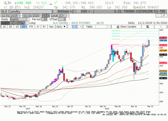 Nisan vade gram altın 30 Mart seansını 6.510 puan yükseliş ile 348.380 seviyesinde yükseliş ile kapadı. . Ons cinsi fiyatlamada spot altının kısa vadeli destek seviyesi üzerinde olması pozitif olmakla beraber dün garm altında yaşanan fiyat yükselişinin TL'in değer kaybı ile gerçekleştiğini gördük. Dolar/TL paritesinde yükseliş trendi sürüyor. Ons altına gelince 1608 dolar üzerinde kaldığı sürece 1645 direnci denenebilir. Bu iki değişkeni bir araya getirdiğimizde gram altında yükselişin sürdüğünü ve geri çekilmelerin alım fırsatı olarak düşünülmesi gerektiğini hatırlatalım.