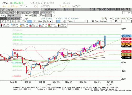 Dün güne 139.925 seviyesinden başlayan endeks ABD-İran gerilimi öncesi zirve seviyesi olan 143.075 direncini de kırarak 145.875 seviyesinde günü pozitif tamamladı.