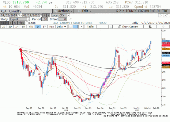 Cuma günü 323.94 lira seviyesinde pozitif kapanış yapan şubat vade gram altında virüs endişelerinin derinleşmesi ile bugün yukarı yönlü gapli bir açılış sonrasında 326 lira seviyesine yükseliş bekliyoruz. İlk yükseliş hareketinden sonra gün içinde konsolidasyon ve bir miktar düşüş görülebilir. Ancak trend çok kuvvetli biçimde yukarı yönlü gelişmektedir. Bu nedenle mevcut long pozisyonların iz süren stoplar kullanılarak tutulması gerektiğini düşünmekle birlikte geri çekilmelerde uygun desteklerde alıcıların artmasını bekleriz.