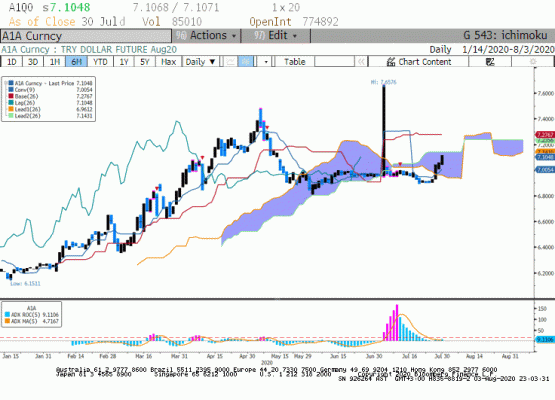 Ağustos Vadeli Dolar TL geçtiğimiz günü 7,4100 seviyesinden kapattı. TL'deki , rezerv endişeleri ve agresif parasal genişlemeci döngüye bağlı olarak dolar karşısında rekor düşük seviyeye geriledi. Gün içerisinde kayıplar yüzde 3 seviyelerini aşarken paritede 7,30 seviyelerin üstü test edildi. Kurdaki volatil hareketler sonrası Merkez Bankası piyasada oluşan fiyat gelişmelerin yakın takip edildiği belirterek ellerindeki tüm araçları kur oynaklığını önlemek için kullanacaklarını açıkladı. Merkez Bankası'nın bu açıklamasını sözlü müdahale olarak değerlendirmekle birlikte paritede eğilimin yükseliş yönünde olduğunu düşünüyoruz.